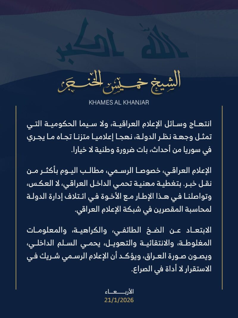 الإعلام العراقي، خصوصا الرسمي، مطالب اليوم بأكثر من نقل خبر. بتغطية مهنية تحمي الداخل العراقي، لا العكس، وتواصلنا في هذا الإطار مع الأخوة في ائتلاف إدارة الدولة لمحاسبة المقصرين في شبكة الإعلام العراقي.