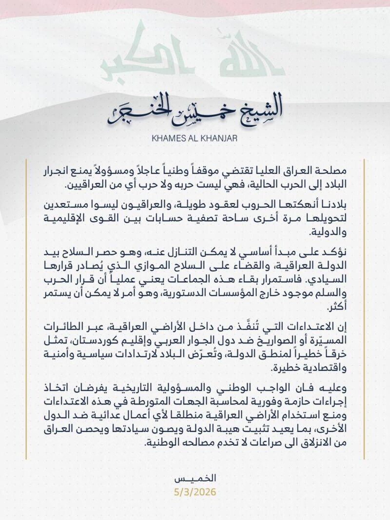 مصلحة العراق العليا تقتضي موقفاً وطنياً عاجلاً ومسؤولاً يمنع انجرار البلاد إلى الحرب الحالية، فهي ليست حربه ولا حرب أي من العراقيين.