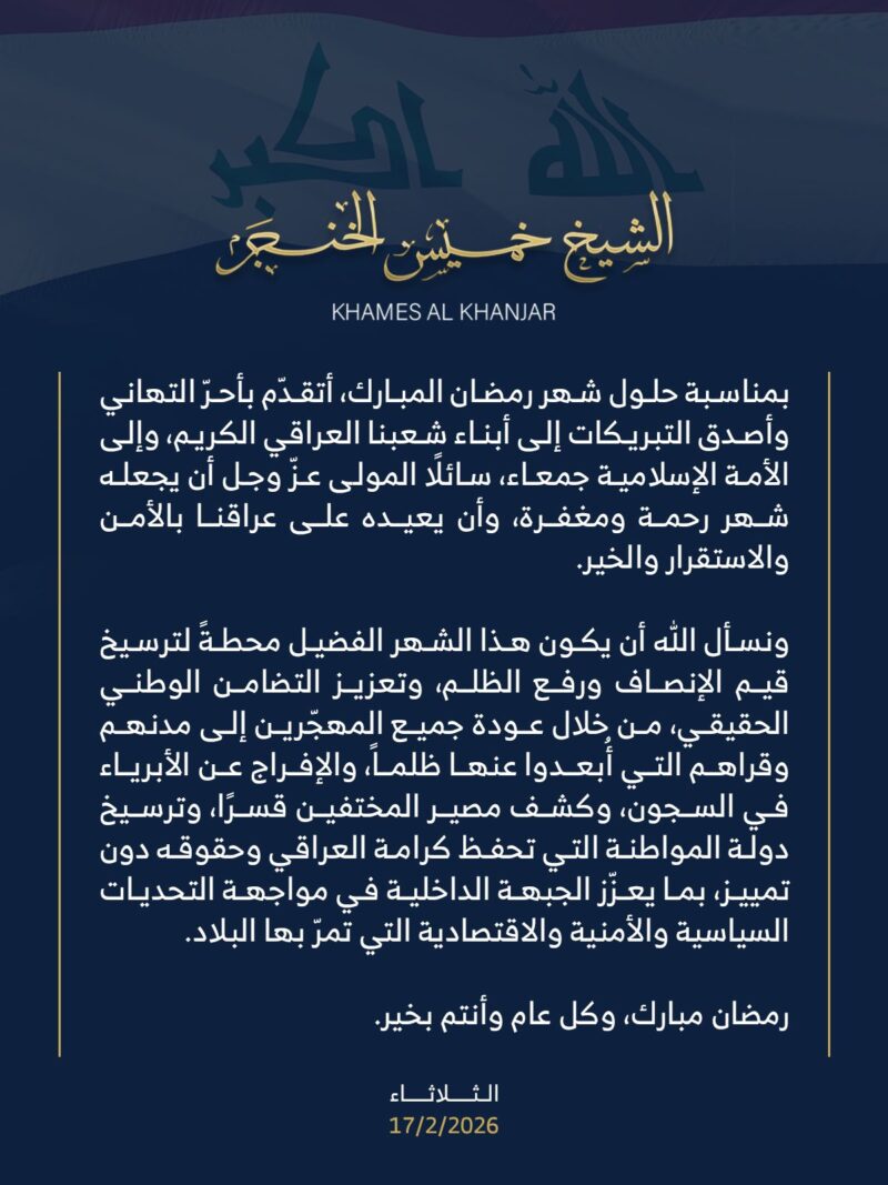 ونسأل الله أن يكون هذا الشهر الفضيل محطةً لترسيخ قيم الإنصاف ورفع الظلم، وتعزيز التضامن الوطني الحقيقي، من خلال عودة جميع المهجّرين إلى مدنهم وقراهم التي أُبعدوا عنها ظلماً، والإفراج عن الأبرياء في السجون، وكشف مصير المختفين قسرًا، وترسيخ دولة المواطنة التي تحفظ كرامة العراقي وحقوقه دون تمييز، بما يعزّز الجبهة الداخلية في مواجهة التحديات السياسية والأمنية والاقتصادية التي تمرّ بها البلاد.