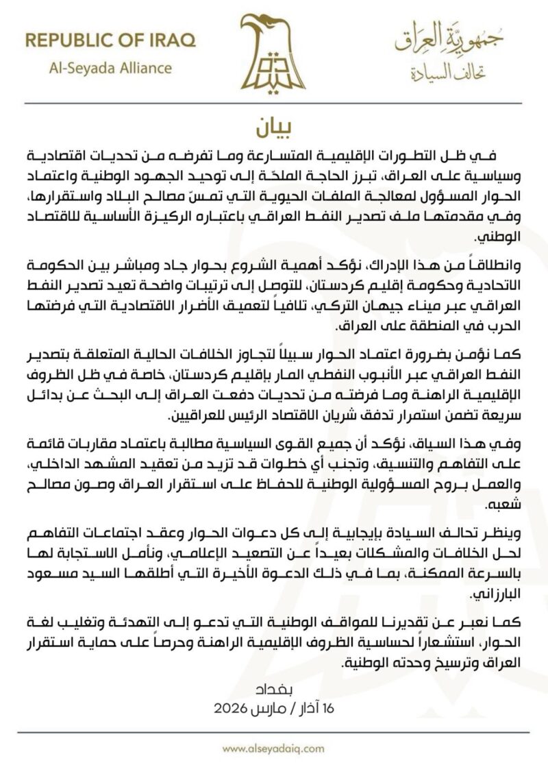 في ظل التطورات الإقليمية المتسارعة وما تفرضه من تحديات اقتصادية وسياسية على العراق، تبرز الحاجة الملحّة إلى توحيد الجهود الوطنية واعتماد الحوار المسؤول لمعالجة الملفات الحيوية التي تمسّ مصالح البلاد واستقرارها، وفي مقدمتها ملف تصدير النفط العراقي باعتباره الركيزة الأساسية للاقتصاد الوطني.