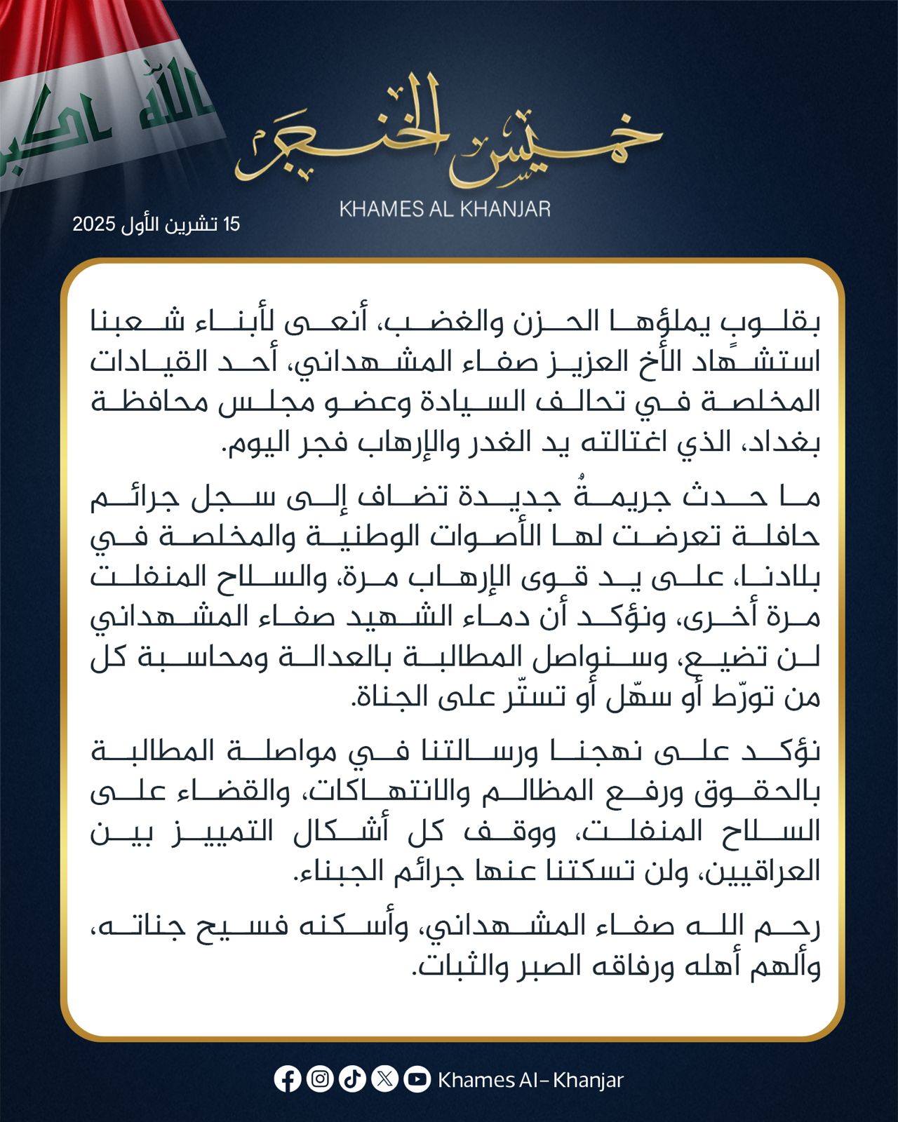 الشيخ خميس الخنجر يستقبل المعزين في مجلس عزاء الشهيد صفاء المشهداني